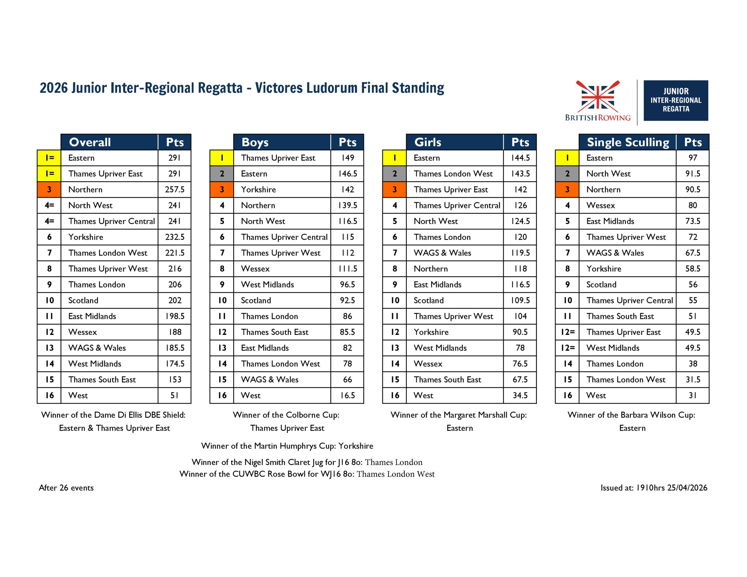 Eastern Region and Thames Upriver East tied for overall first place. Victor Ludorum positions are shown in the tables below.